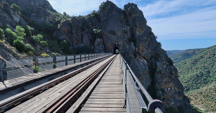 Gleich hinter dem Tunnelausgang, etwa bei Kilometer 67, folgt Tunnel Nummer 6, Poyo Valiente, mit 358 m schon etwas länger. Aus der Dunkelheit heraus blickt man direkt auf das gleichnamige Viadukt. 137 m lang und 16 m hoch.