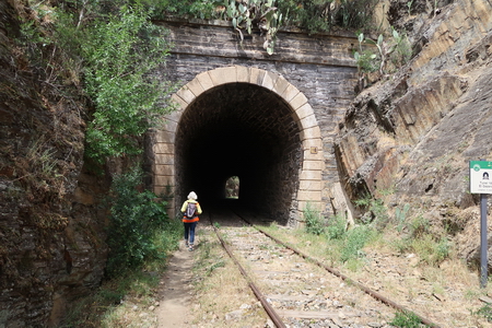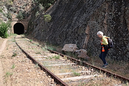 Der gleichnamige Tunnel (Nr. 19) ist nur 73 m lang. Er führt noch einmal in eine felsige "Schlucht". So langsam spüren wir unsere Beine, das Gehen auf dem steinigen Pfad oder den Bahnschwellen hat seinen Preis.