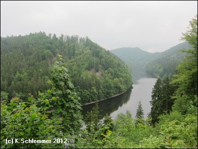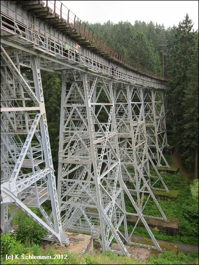 Die Fahrt führt durch eine einsame Waldlandschaft abseits des motorisierten Verkehrs. Von der hoch am Hang verlaufenden Bahnstrecke aus hat man stellenweise einen atemberaubenden Blick weit hinab ins Saaletal und den Beginn des Aufstaus der Talsperre Hohenwarte. Der Stopp an der Ziemestalbrücke ist ein Muss. An dem eigenwilligen Bauwerk wird deutlich, was die Ingenieurskunst vergangener Zeiten zustande gebracht hat. Zwischen 1893 und 1895 entstand das 115 m lange und 35 m hohe Viadukt aus vernieteten Stahlträgern. 10 Pfeiler tragen die Konstruktion, die das Tal in einer langegezogenen Kurve überbrückt. Von der Ferne aus wirkt die filigrane Konstruktion wie aus Streichhölzern erbaut. Der Blick auf die Burgruine Wysburg aus dem 11. Jahrhundert war vom Viadukt aus 2012 leider wegen des starken Bewuchses nicht möglich.
