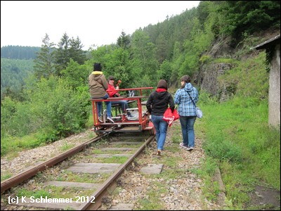 Eine Fahrt mit der Fahrrad-Draisine auf der Strecke der Thüringer Oberlandbahn ist ein besonderes Vergnügen. Bisher besteht die Möglichkeit zu Fahrten an festgelegten Terminen, besonders während der Thüringer Sommerferien (Info auf der Webseite des Thüringer Oberlandbahn e.V.) Außerhalb dieser Termine kann man auch eine Draisine mieten (max. 12 Personen), was natürlich nur für Gruppenausflüge interessant ist (Preis 2012 : pauschal 250.-, Informationen auf der Webseite des Vereins). Es werden 3 Streckenabschnitte angeboten, am interessantesten erscheint uns die Strecke Lückenmühle - Ziegenrück, da sie durch 4 Tunnel und über die mächtige Ziemestalbrücke führt. Die Draisine wartet am Ausgangspunkt Lückenmühle, man fährt mit fachkundiger Begleitung fast nur abwärts nach Ziegenrück. Für die Hinfahrt zum Ausgangspunkt ist ein Taxi/Fahrdienst erforderlich. (Kosten 2012 für 7 Personen ca. 20 €). Für die rund 11 km Fahrt mit Zwischenstopps sollte man 1,5-2 Stunden einplanen.