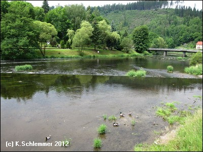 Nach dem Tunnel wird der Blick auf die aufgestaute Saale frei: km 33 der Strecke.