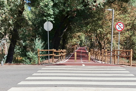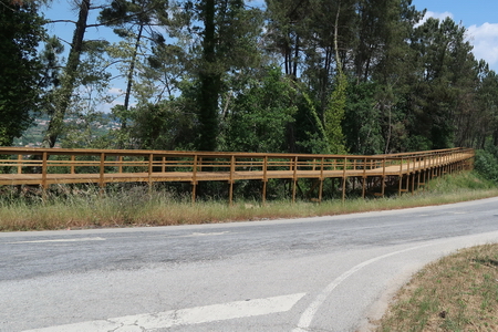 Kurz vor Real das Donas mündet die Trasse in die Straße. Ein Holzsteg verläuft am Straßenrand, eine ungewöhnliche Lösung für Fußgänger (und Radler?)