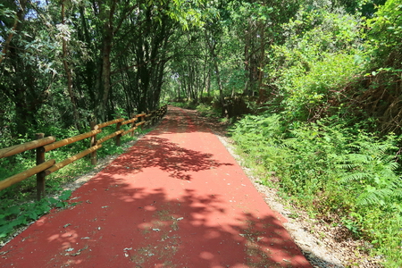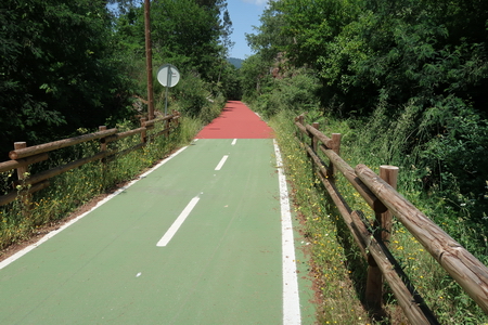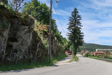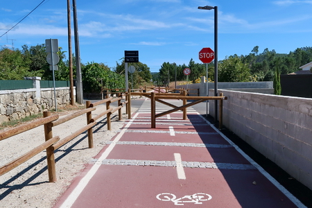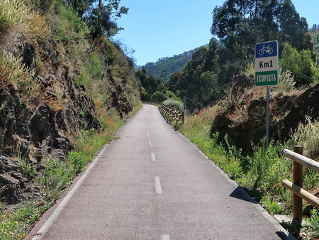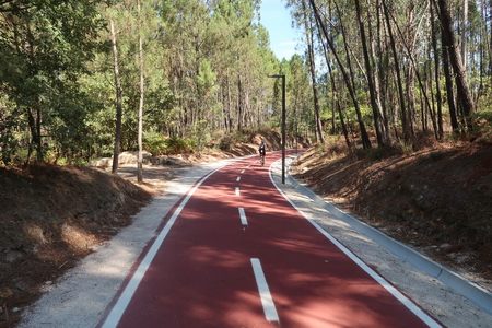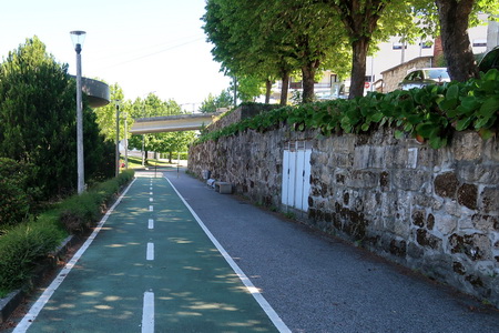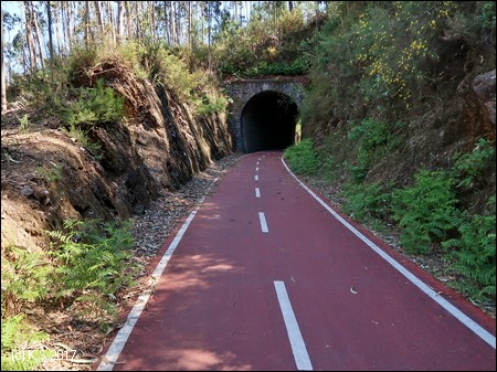 Der Radweg ist auch nach der Straßenüberquerung grün asphaltiert, durch den 25 m kurzen Tunnel Lamas geht es zügig bergab. Etwa 3,2 Km vom Bahnhof Vouzela entfernt, nahe Termas de Sao Pedro, wechselt der Asphalt auf die Farbe rot.