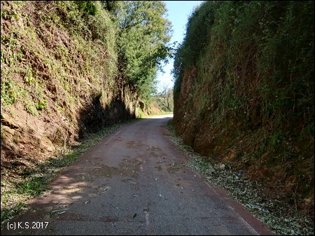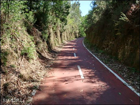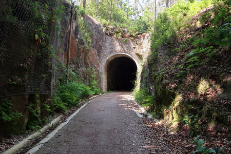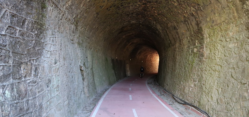 Hinter der Kurve wartet schon der nächste Tunnel, mit 60 m der längste dieses Radwegs. Die Trasse hat nun schon merklich an Höhe gewonnen und führt durch eine Waldlandschaft, geprägt von Eukalyptusbäumen.