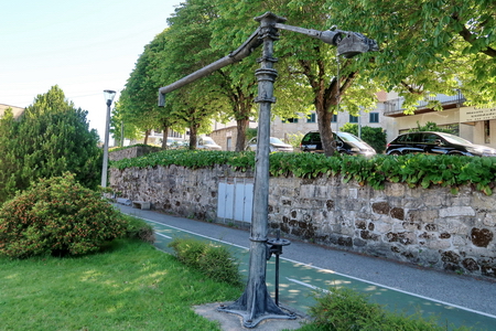 Auf kleinen Straßen geht es innerorts hinab, knapp 2 km bis zum ehemaligen Bahnhofsgelände. Auf dem Grünstreifen am Kreisverkehr steht der alte Wasserhälter für die Dampfloks verloren zwischen dem quirligen Autoverkehr der N 2. Dort beginnt die Ecopista do Dão auf der stillgelegten Bahnstrecke nach Santa Comba Dão.