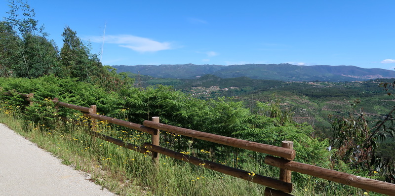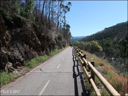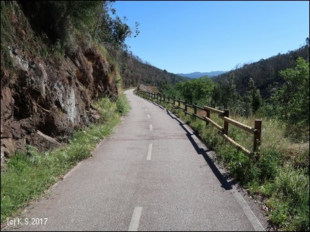 .........ist ein komfortabler Radweg entstanden. Auf der langen Höhenschleife spürt man den Anstieg durch die einsame Waldlandschaft kaum. An der Kehre lag der ehemalige Haltepunkt Fataunços. Der Blick weit über die Landschaft wird frei.