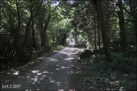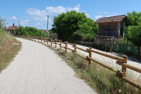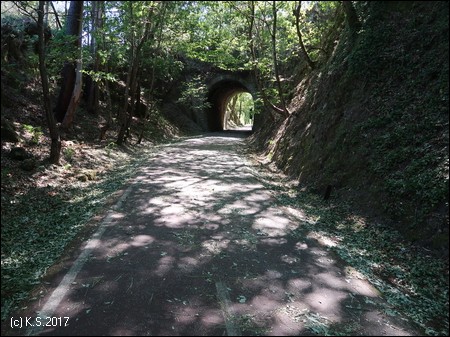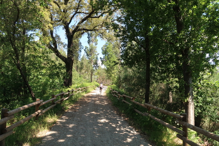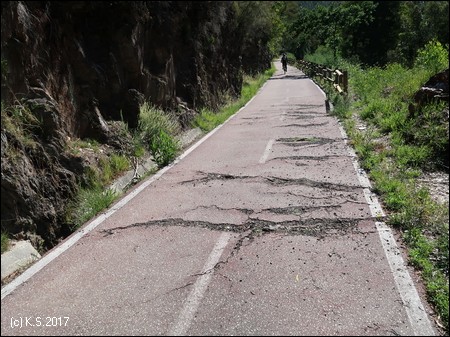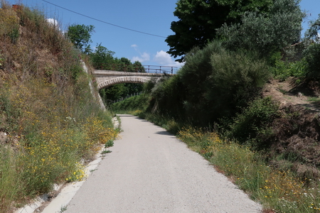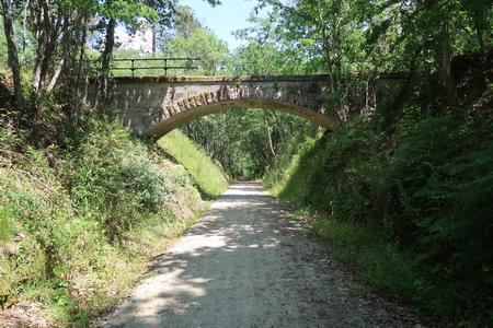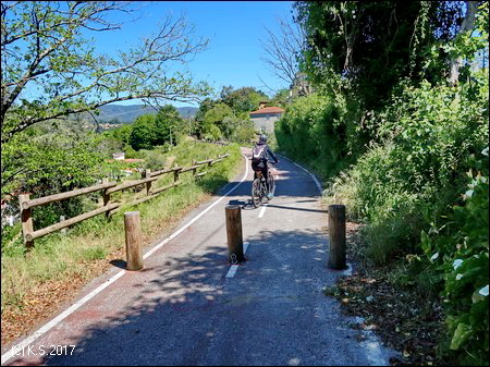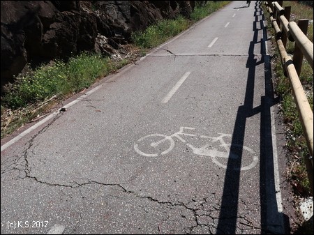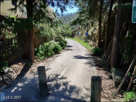 Zur Erinnerung an die Bahnstrecke hat man ein altes Gleis aufgestellt. Die Asphaltfahrbahn ist nun zu Ende. Eine lange Höhenschleife hat begonnen und überwindet auf 5 km etwa 100 Höhenmeter hinauf in die Berge. Auf dem einst schmalen, fast zugewachsenen Pfad (2017) ....