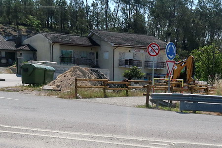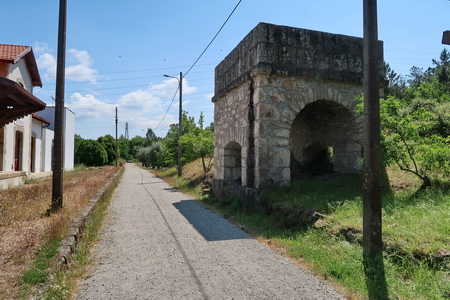 Weiter durch den Ort Queirela, dann durch ein "Felsentor". Am Haltepunkt Travanca de Bodiosa überquerte die Trasse die N16. Im Mai 2023 waren hier noch Bauarbeiten am Radweg im Gang.