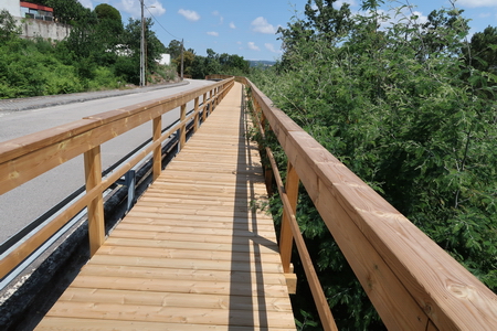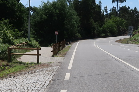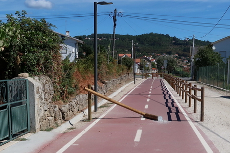 Durch die Straßenführung ist die Bahntrasse unterbrochen und muss umfahren werden. Ein unfertiger Holzsteg (Stand Mai 2023) auf beiden Seiten verspricht baldige Besserung. Nach der Umfahrung mit einem steilen Abschnitt (ca. 300 m) erreicht man wieder den Weg auf der Trasse. In zwei großen Schleifen geht es auf Asphalt hinab zum Tal des Rio Vouga.