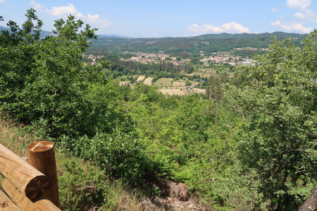 Mit dem Fernglas erkennt man weit unten im Tal den Bahnhof von S.Pedro do Sul, den wir vor kurzem passiert haben. Am Dorf Monsanto hat noch eine Brücke die Zeit überdauert, die einsame Waldlandschaft weicht nun den Weinanbaugebieten.