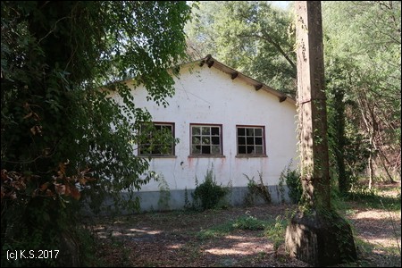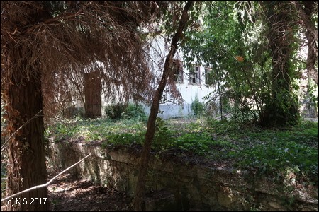 Als Kontrast dient der alte quadratische Wasserbehälter gegenüber. Man folgt nun dem kerzengeraden Weg auf der alten Bahntrasse durch ein Waldgebiet.