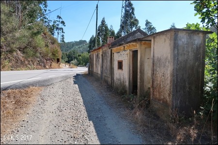 Versteckt im Unterholz erkennt man neben der Strecke einige alte Gemäuer - wahrscheinlich die Holzkohlefabriken, denen der Ort seinen Namen verdankt: Carvoeiro (= Köhler), ein weit verbreiteter Ortsname in Portugal.