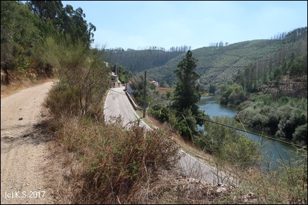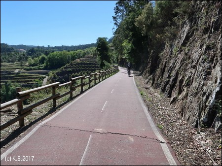 Direkt im Anschluss leitet die Brücke von Negrelos über den Rio Vouga die nächste Kehrschleife ein, denn nun geht es wieder hinauf in die Berge. Hier endet auch schon wieder der Ausbau des Radwegs (Blick zurück).