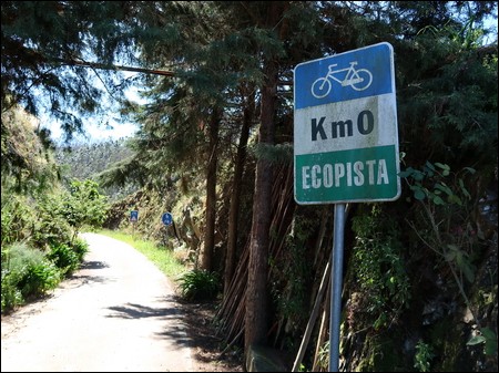 Die Kilometrierung Ecopista ist nicht einheitlich, hier ist das erste Mal der Kilometer Null der ausgebauten Strecke.