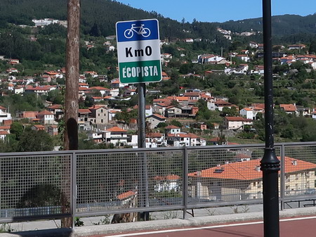 Hier auch wieder Kilometer Null? Den hatten wir doch schon einmal: in Foz do Rio Mau! Wellenförmig: Über eine Straßenbrücke, verlässt die Ecopista den Ort (Blick zurück)