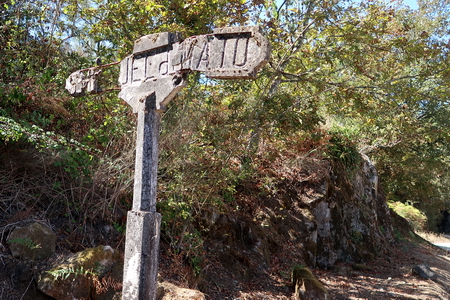 Ein Wegweiser des Jakobswegs steht an der Kreuzung (Blick zurück). Oberhalb der Straße, an den Felsen entlang führt die Trasse unmerklich etwas bergauf.