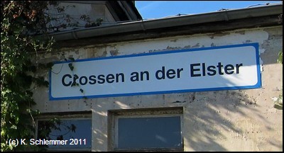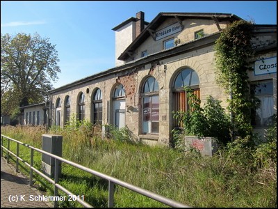 Das Bahnhofsgebäude Crossen/Krossen, am Abzweig der ehemaligen Bahnstrecke Richtung Eisenberg, ist in einem bedauernswerten Zustand.