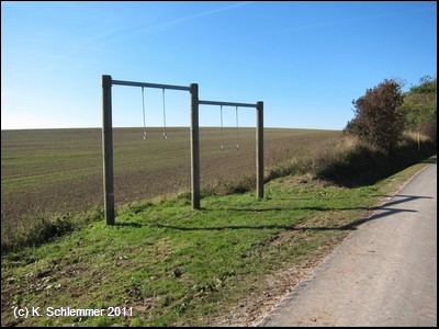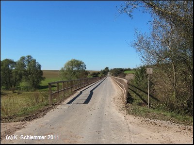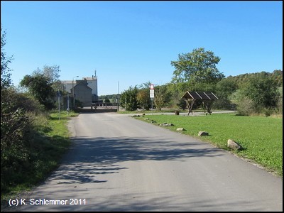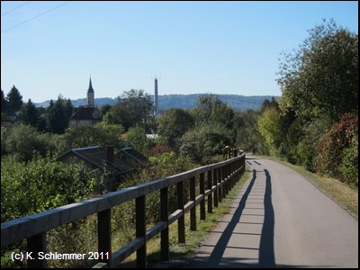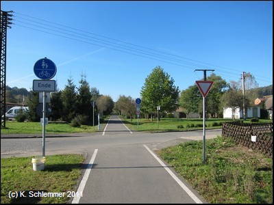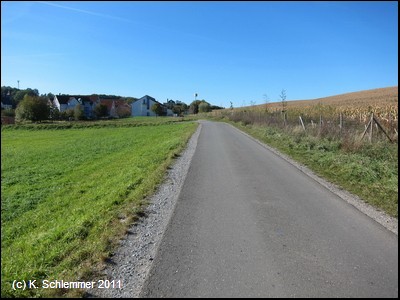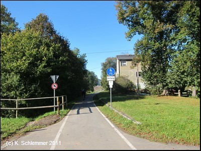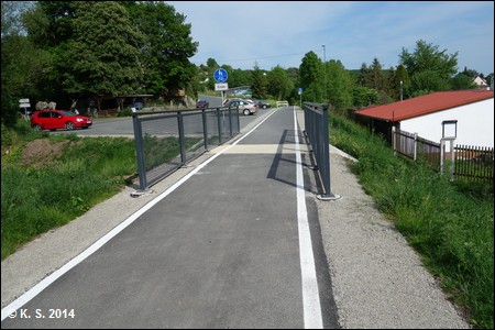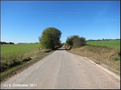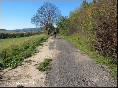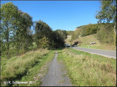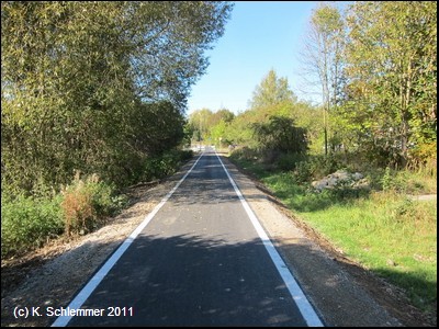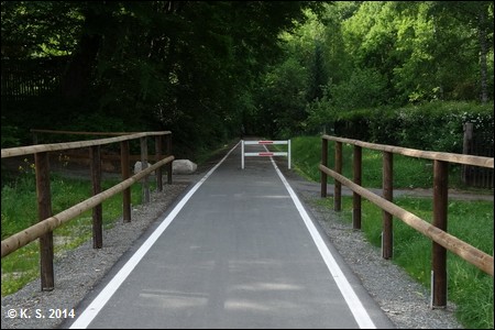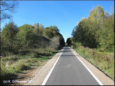 Am Ort vorbei hat man ein kleines Stück Trasse asphaltiert. Danach, über die Felder und am Straßenrand entlang, ist es nur noch ein schmaler Pfad.