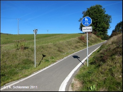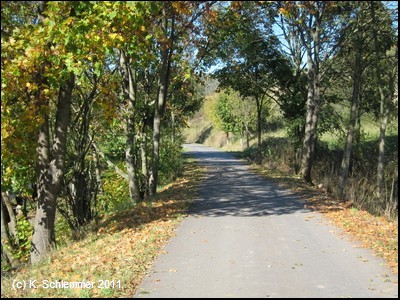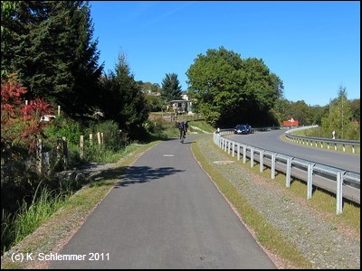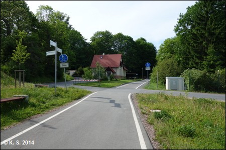 Dann ist das Ende des Radwegs an der Straße vor Golmsdorf erreicht (Blick zurück). Die Straße wurde erneuert, die alten Gleisreste sind verschwunden. Etwas Hang aufwärts kann man noch ein kurzes Stück auf der Trasse in den Ort fahren.