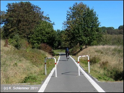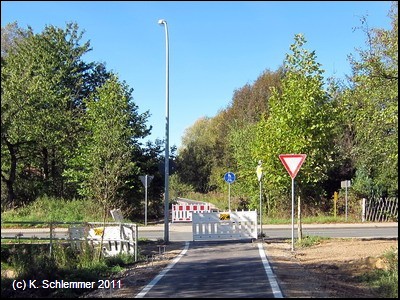 Ein toller Radweg führt uns leicht bergauf. Die Kreuzungen sind inzwischen barrierefrei, die Pfostensperren sind verschwunden.