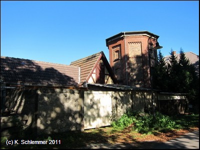 Auch ein Wasserturm ist aus der Eisenbahnzeit noch übrig geblieben. Die Abfahrt beginnt, halbseitige Sperren begrenzen die Zufahrt für Autos.