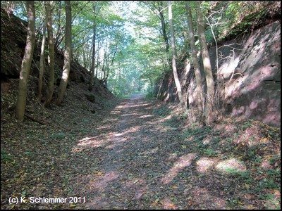 Blick zurück: In Kursdorf: Hier fehlt wohl eine Brücke. Wir sind am Abzweig des Mühltalsweg/Thüringer Städtekette Richtung Bad Klosterlausnitz. Eine Rampe führt wieder hinauf auf die Bahntrasse.