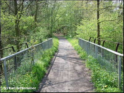Aber auch der Waldweg ist gut befahrbar. Die Brücke bei der Papiermühle überquert die Trasse.