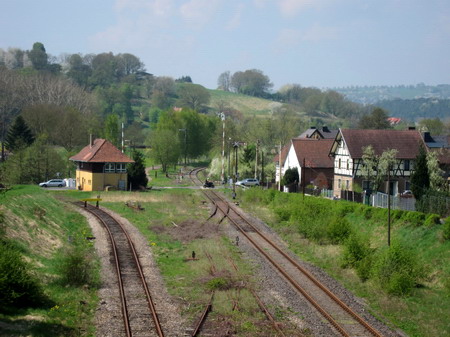 Am Ortsende steht ein Wegweiser nach Stadtlengsfeld: rechts abbiegen! Der Weg an den Gleisen entlang ist nicht asphaltiert.