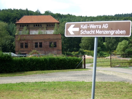 Am ehemaligen Haltepunkt Menzengraben dann zwei Poller, es geht auf die Straße hinauf und rechts ab. Wir erreichen den alten Kalischacht Menzengraben.