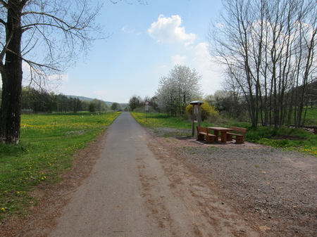 Nach der Straßenkreuzung am Bahnhof Zella wurde 2017 der Radweg auf der Trasse fertiggestellt. Rechts oberhalb am Hang liegt der Ort Zella mit der Probstei und der Kirche.