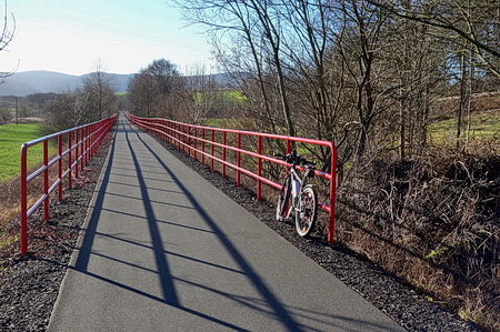 Der Radweg folgt weiter der Trasse und der Felda aufwärts. Rote Geländer begrenzen den Radweg an den steilen Flanken. Leider gibt es auch hier wieder Pfostensperren. Die Brücke über die Felda wurde von Grund auf erneuert.