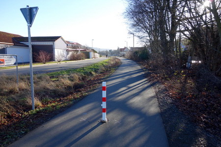 Ohne Pfostensperren geht es wohl nicht? Vor Weilar rechts abbiegen Richtung Bundesstraße, hier beginnt der neue Radweg.