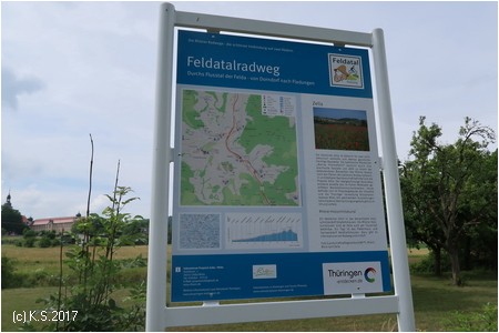 In Dorndorf zweigt die Feldabahn von der Werratalbahn ab. Beide Strecken sind seit 2008 stillgelegt, die Gleise sind aber noch vorhanden. Den ersten Wegweiser findet man vor dem Kulturhaus (Parkplatz!) an der Brücke. Man fährt in westlicher Richtung hinab zur L1022 (Lengsfelder Straße). Dort rechts abbiegen und über die Gleise der Feldabahn, die hier von der Werratalbahn abzweigen. Gleich wieder links abbiegen auf den Feldweg. Nach 250 m überquert man die Felda, dann wieder links abbiegen und am Fluss entlang.