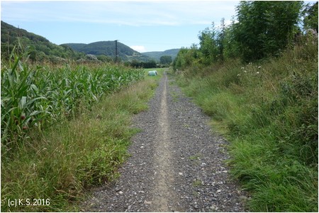 Hier liegen noch die Schwellen ohne Schienen, die Trasse ist ungenutzt. Ein asphaltierter Weg folgt parallel der Trasse.