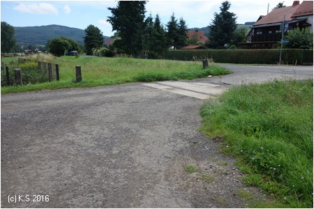 An der Straßenkreuzung wieder Pfostensperren, die bei Bedarf umgeklappt werden und als gefährliches Hindernis auf der Fahrbahn liegen. Als nächstes erreicht man den Bahnhof Weilar-Urnshausen.