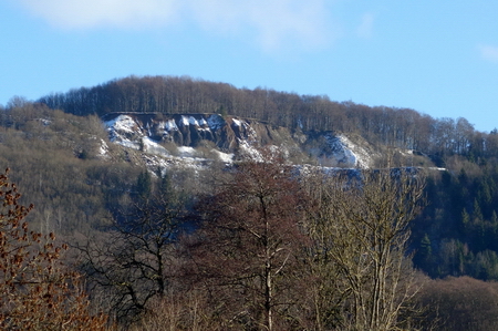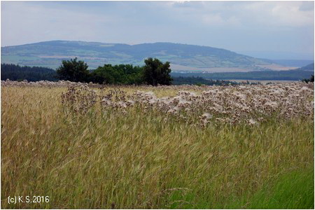 Wer den Aufstieg auf den erloschenen Vulkan wagt, blickt weit in das Feldatal hinab. Von hier aus verband eine Seilbahn den Basalt-Steinbruch mit der Bahnstrecke. Die Reste der technischen Anlagen kann man im Dickicht versteckt noch am Rand der Trasse finden.