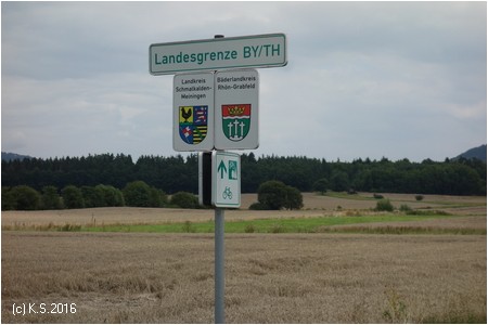 Infotafel und Beschilderung im Ort: rechts abbiegen (noch ca. 9 km nach Fladungen). Knapp 2 km weiter überquert man die Landesgrenze zwischen Bayern und Thüringen. Hier befand sich einst die innerdeutsche Grenze!