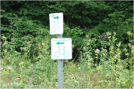 Der Radweg auf der Bahntrasse endet hier. Die Beschilderung des Feldtalradwegs führt die Radler weiter nach Kaltensundheim.