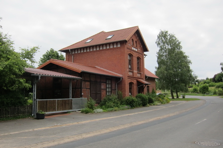 Auch auf dem Abschnitt kurz vor der Ortseinfahrt wäre etwas Pflege kein Luxus. Der alte Bahnhof (Privathaus) dagegen ist ein Schmuckstück.