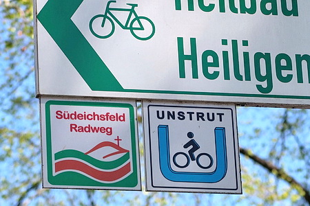 Die neuen Wegweiser des Südeichsfeld-Radwegs stehen an der Straße vor dem Bahnhof. Es geht durch das Pferdebachtal hinauf nach Kalteneber und Fürstenhagen auf der Trasse der alten Bahnstrecke.