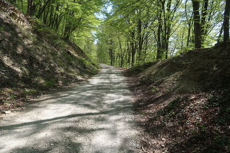 Am Rande des Radwegs findet man hin und wieder überdachte Rastbänke. Trotz des für eine Bahnstrecke recht kräftigen Anstiegs ist die Fahrt durch den Wald ein Genuss.