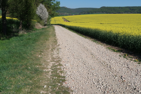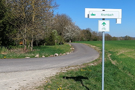 Am östlichen Ortsende von Krombach biegt der neue Südeichsfeldradweg nach rechts ab auf einen Feldweg. Ein kurzer kräftiger Anstieg führt auf der recht ruppigen Piste hinauf auf den Hügel.