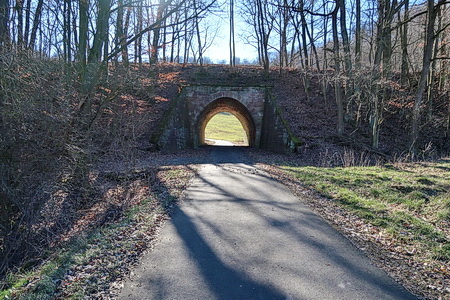 Versteckt im Wald am Hang des Großen Dachsberges liegt das Ostportal des Friedatunnels, halb verdeckt von der üppigen Vegetation und umgestürzten Bäumen. Der Friedatunnel,1066 m lang, wurde ab Oktober 1989 wegen Baufälligkeit verfüllt und versperrt. Nur einige hundert Meter weiter talaufwärts erkennt man hoch über dem Radweg ein Brückenlager des gesprengten Friedaviadukts.