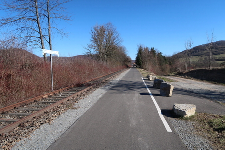 Direkt neben dem Gleis fährt man auf einer asphaltieren Fahrbahn nach Lengenfeld untern Stein. Vor dem Bahnhof, an einem Prellbock, wechselt der Kanonebahnradweg noch auf die andere Seite.