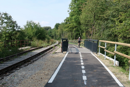 Die Fahrt geht weiter, Wo Anfang 2017 noch Gleise lagen, ist nun der fertige Radweg parallel zur Draisinenstrecke. An der kleinen Brücke waren aufwändige Arbeiten notwendig. Man fährt an den Fragmenten der alten Brückenpfeiler vorbei.