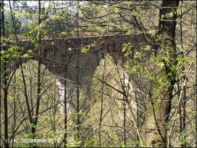 Wir erreichen ein großes, baufälliges Viadukt, dessen Bögen durch Stahlanker gehalten werden. Betreten verboten! Einsturzgefahr!