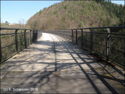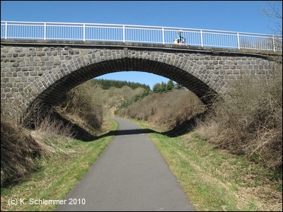 Wieder geht es unter der A1 hindurch, dann erreicht man den alten Bahnhof von Manderscheid-Pantenburg. Es folgt ein schönes Wegstück mit dieser tollen Brücke über einen Einschnitt.