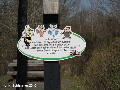 Etwas Spezielles hat man sich für Kinder einfallen lassen: Der Abschnitt zwischen Gillenfeld und Daun wurde als Kinderradweg mit besonderen Informationen für Kinder ausgeschildert.