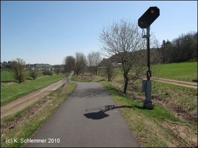 Am Ortsende geht es los. Ein altes Vorsignal steht an der Strecke.
