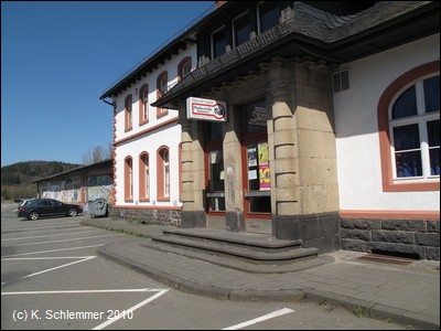 Der Bahnhof Schalkenmehren taucht auf. Auf dem Bahnhofsgelände befinden sich einige Eisenbahnrelikte.